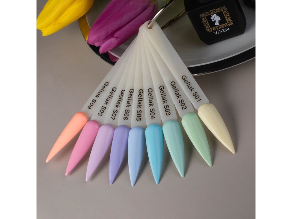 Barevná paleta Verin Gellak se skládá z velkého množství barev a odstínů, které potěší sytostí a hustotou. Struktura a pigmentace Verin Gellak umožňuje snadné pokrytí nehtu v jedné vrstvě, což snižuje práci každé nehtové designérce a usnadňuje práci začátečníkům.